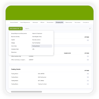Trading Name and Trading Area are now imported from Companies Office into CAS 360 and stored in the Company Information screen. Related Company Report templates have been updated to include these fields where applicable.